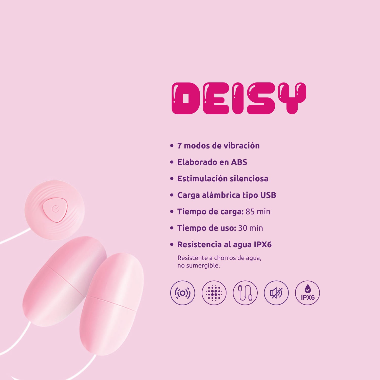 El Huevo Vibrador Deisy tiene un control remoto se utiliza para encender y apagar el huevo vibrador, así como para controlar los patrones de vibración y la intensidad. El control remoto se conecta de forma alámbrica al huevo vibrador, lo que permite un manejo cómodo y discreto. El Huevo Vibrador Deisy es un juguete sexual compacto y discreto que proporciona estimulación interna y externa.
